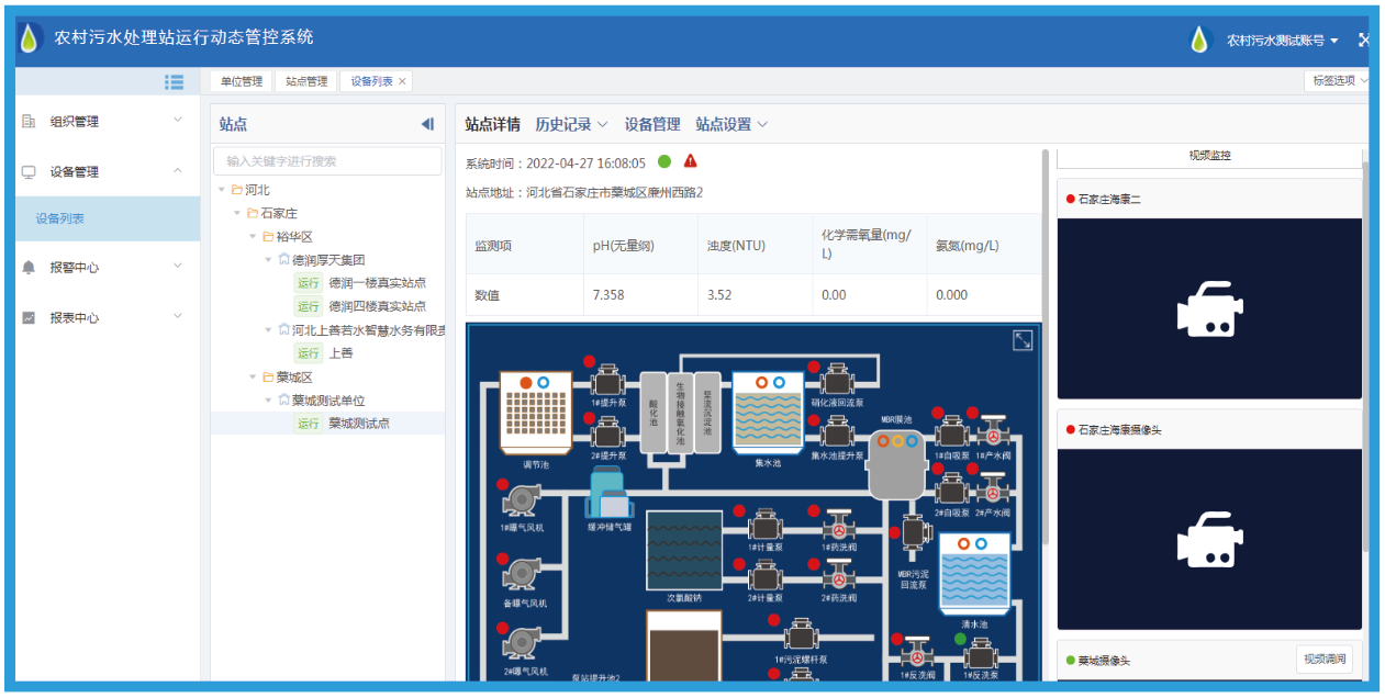 軟件平臺:將監測數據以及現場視頻進行集中展示,管理者可以清晰地看到各個生活污水處理站的監測數據及視頻。