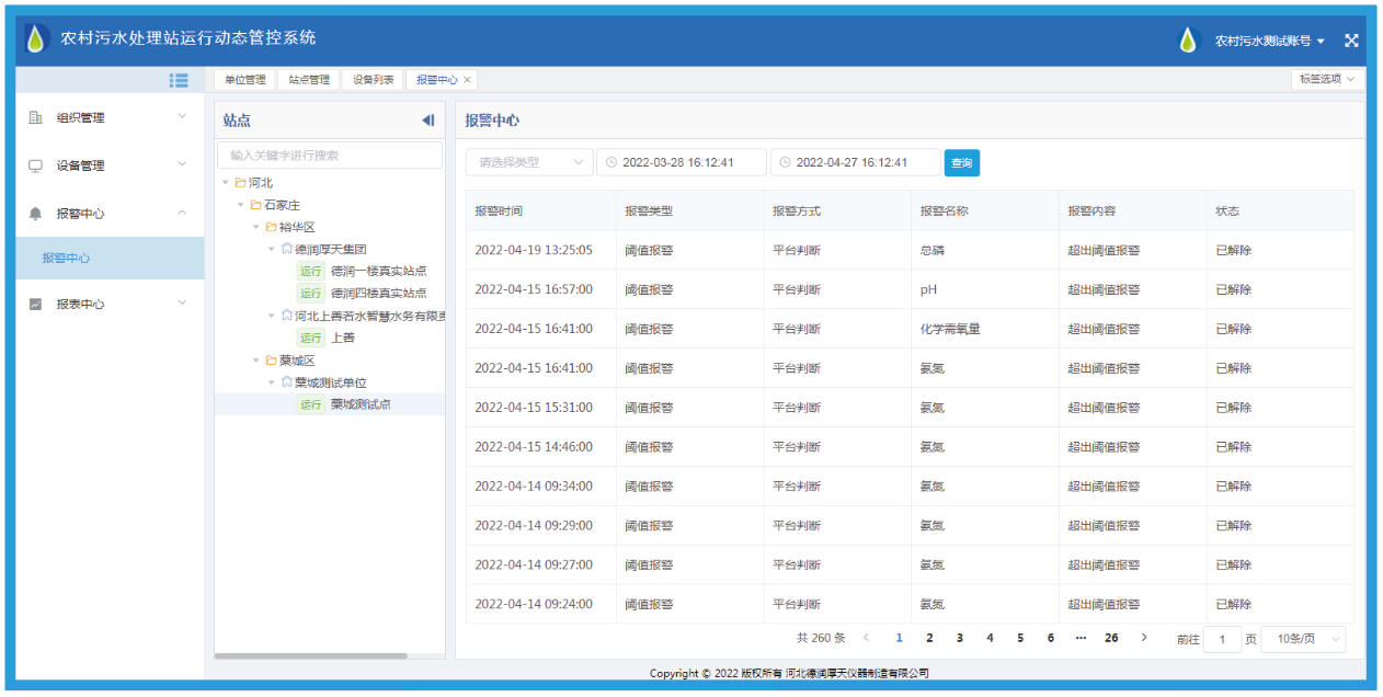 河北德潤厚天儀器制造有限公司一直致力于環保監測設備研發制造,公司研發團隊負責人曾多次深入農村生活污水處理站實地考察,結合現場實際情況,經過大量實驗及實地測試,開發出農村污水處理站運行動態管控系統。