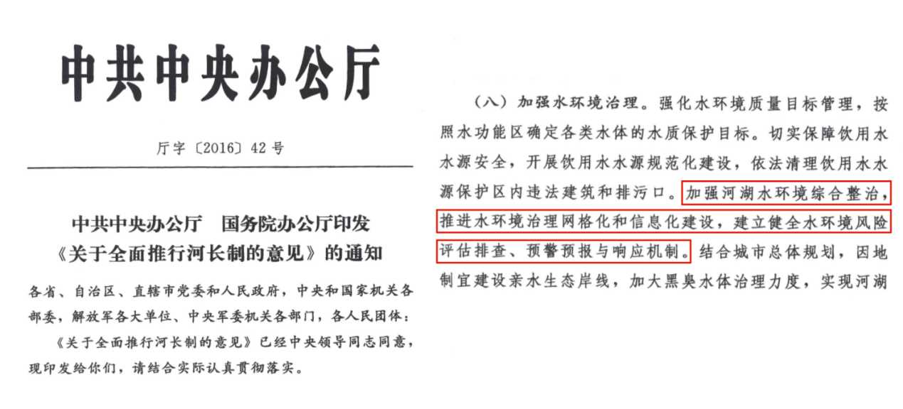 河長制六大任務(wù)中提出:加強(qiáng)河庫水環(huán)境綜合整治,推進(jìn)水環(huán)境治理網(wǎng)格化和信息化建設(shè),建立健全水環(huán)境風(fēng)險(xiǎn)評(píng)估排查、預(yù)警預(yù)報(bào)與響應(yīng)機(jī)制。